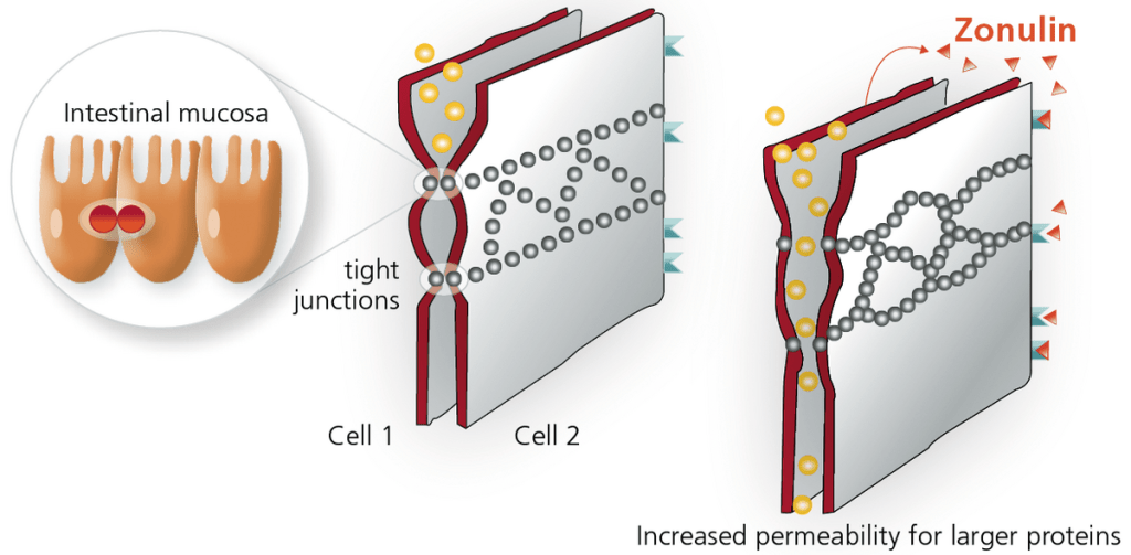 When zonulin rises, those tight junctions loosen and the barrier leaks.