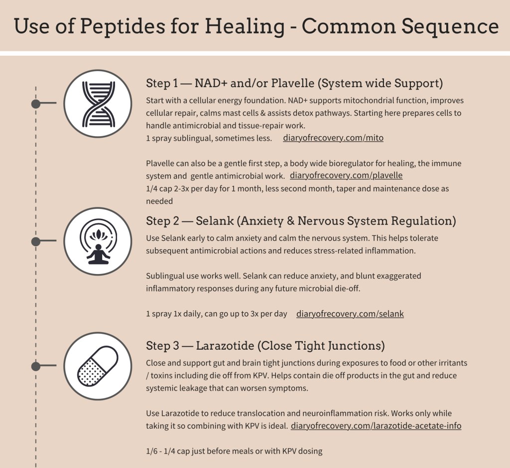 - KPV: Calms inflammation and mast cells; gentle antimicrobial support for a quieter gut and skin.